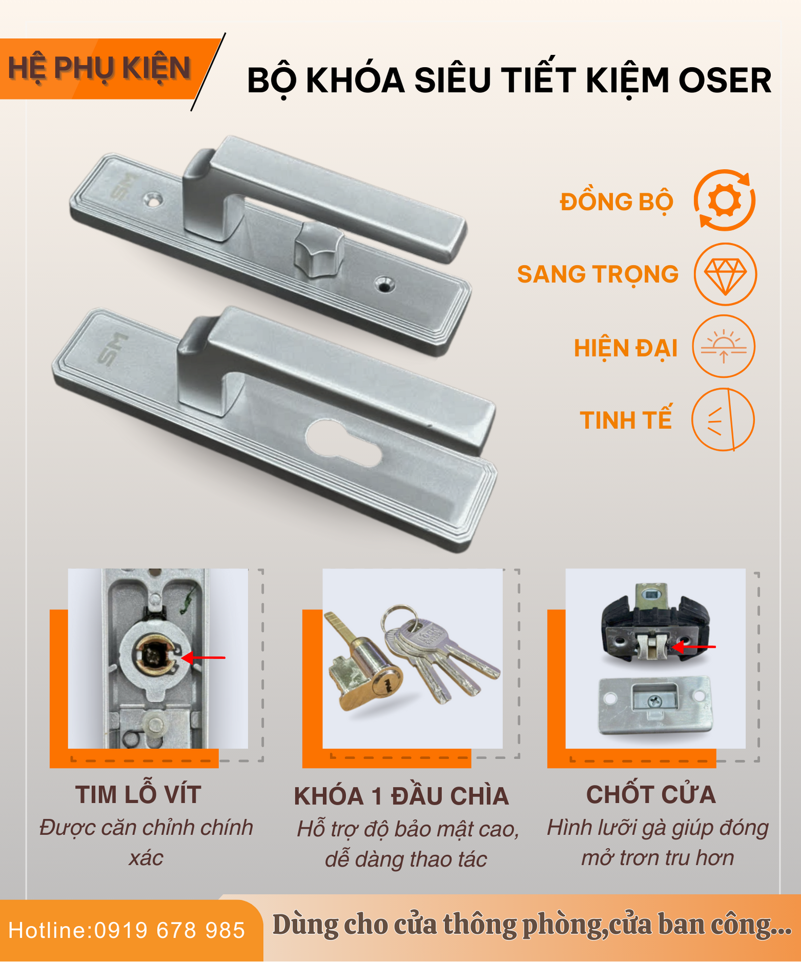 Bộ khóa siêu tiết kiệm OSER là sản phẩm được thiết kế dành cho các công trình dân dụng và nhà ở hiện đại, đáp ứng đầy đủ các tiêu chí: giá thành phải chăng – sử dụng bền bỉ – thao tác đơn giản – thẩm mỹ hài hòa. Sản phẩm đặc biệt phù hợp cho cửa thông phòng, cửa ban công nhôm kính, mang lại sự tiện lợi và an toàn trong quá trình sử dụng hằng ngày.